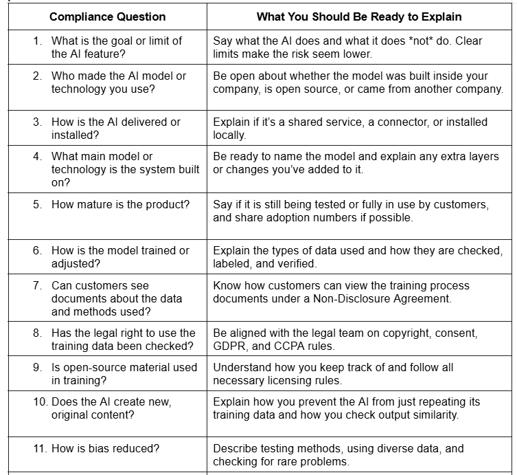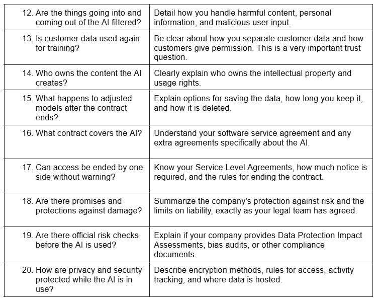 These are the main questions that keep showing up in AI questionnaires. You should have clear, consistent answers for every one.