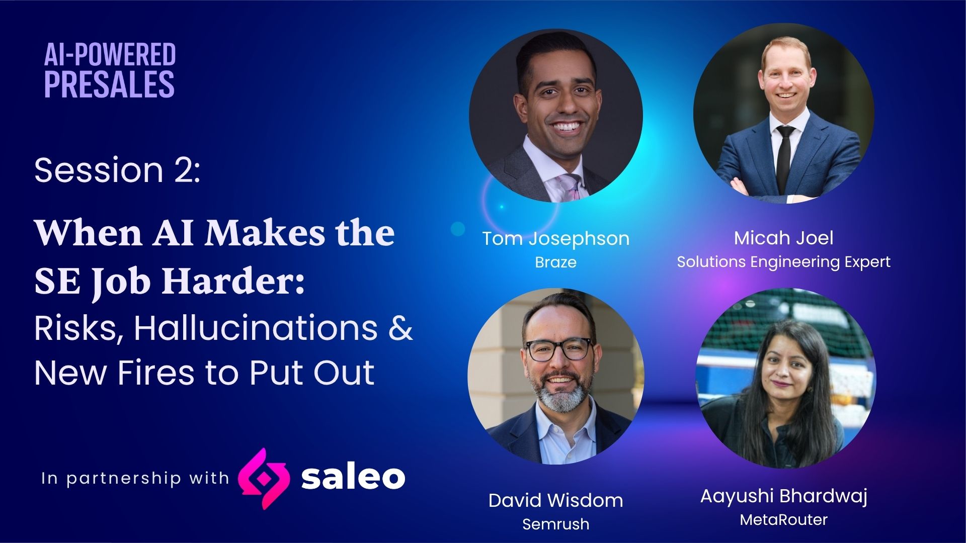 In this session, we’ll examine how AI can sometimes make the Solutions Engineer role more complex, introducing new risks, hallucinations, and unexpected challenges. We’ll discuss how teams can responsibly leverage AI while identifying potential pitfalls, managing emerging risks, and preparing for the new problems AI can create in presales workflows.