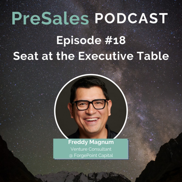 On the PreSales Podcast, James Kaikis and Freddy Magnum connect on the topic "Seat at the Executive Table”. Freddy, Venture Consultant at ForgePoint Capital, talks about PreSales having a Seat at the Executive Table. Freddy offers his insight as an executive on what the PreSales profession should be doing to elevate and how to do so.